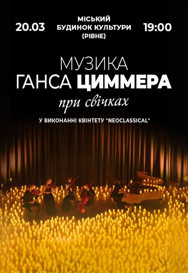 Музыка Ганса Циммера при свечах состоится 20 марта 2026, 19:00, пятница в Городской дом культуры. С помощью сервиса internet-bilet.ua, Вы сможете с легкостью забронировать, заказать и купить билеты на интересующий Вас концерт, спектакль, оперу, балет, мастер-классы, спортивные и детские мероприятия, оплатив их самым удобным для Вас способом: через интернет банковской картой VISA/MasterCard, наличными или курьером, если сделаете заказ билета c доставкой.